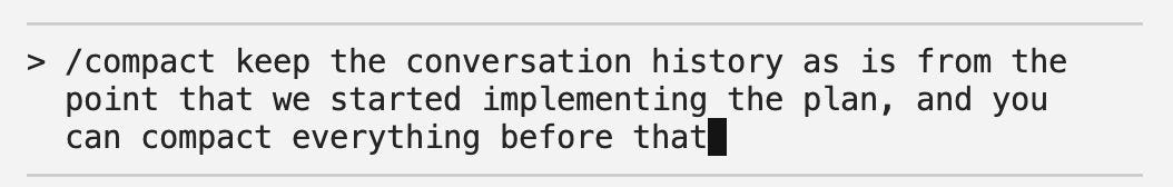 A few days later, I noticed that Claude Code’s /compact command allowed me to add optional custom compacting instructions!