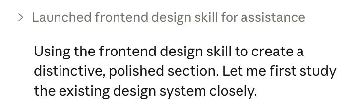 This together with a design system makes things that look way better. This is Claude Code using the frontend skill and existing components together. (Btw, this skill can be used in Cursor just as well - it’s just a text file with instructions).