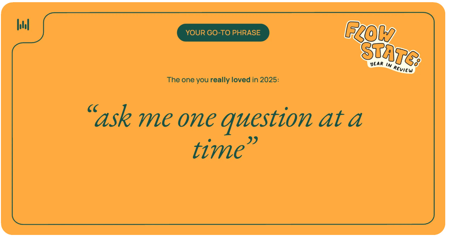 Wispr (my speech to text app) says my most-used phrase with AI is “ask me one question at a time.” It got me to reflect on why I say this so often.
